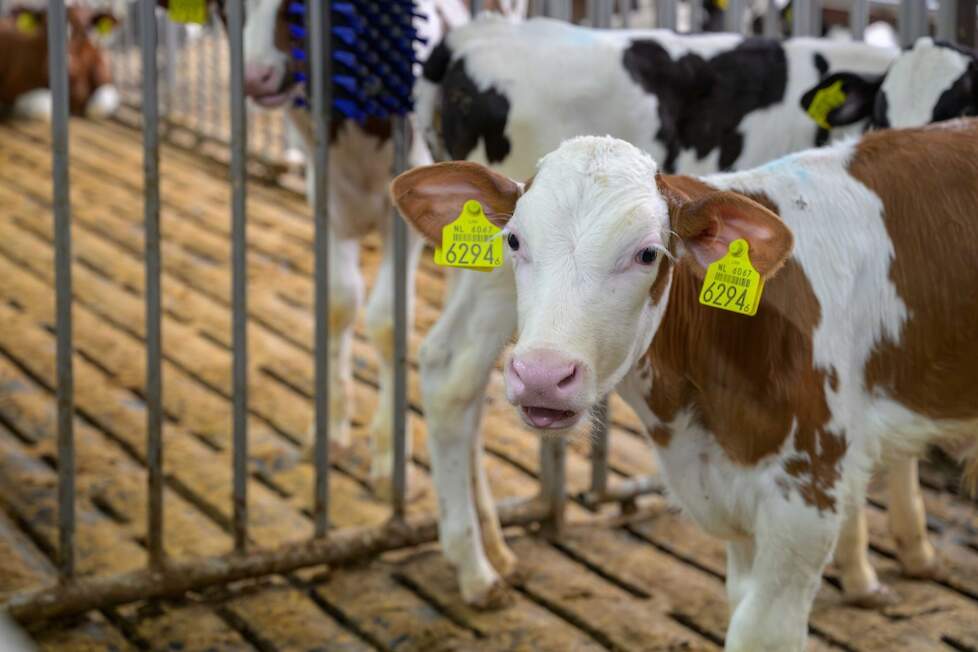 In de nieuwe stallen met luchtwasser valt de rust in de stal direct op. Mede door de lichtstraat bovenin de hoge stal heerst er een fris klimaat dat zorgt een prettige omgeving voor mens en dier. In de stallen zijn twee keer 300 kalveren gehuisvest. De kalveren staan op een rubberen vloer en hebben twee m2 ruimte per kalf, sinds maart 2024 de norm bij nieuwbouw van kalverstallen.