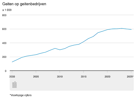 Volgens de voorlopige cijfers uit de landbouwtelling blijft het aantal geitenbedrijven in 2024 en 2025 gelijk: 413 geitenhouderijen. De afgelopen vijf jaar is een gemiddeld geitenbedrijf even groot gebleven. In 2025 telt een geitenbedrijf gemiddeld 1.434 dieren, in 2020 waren dit er evenveel.