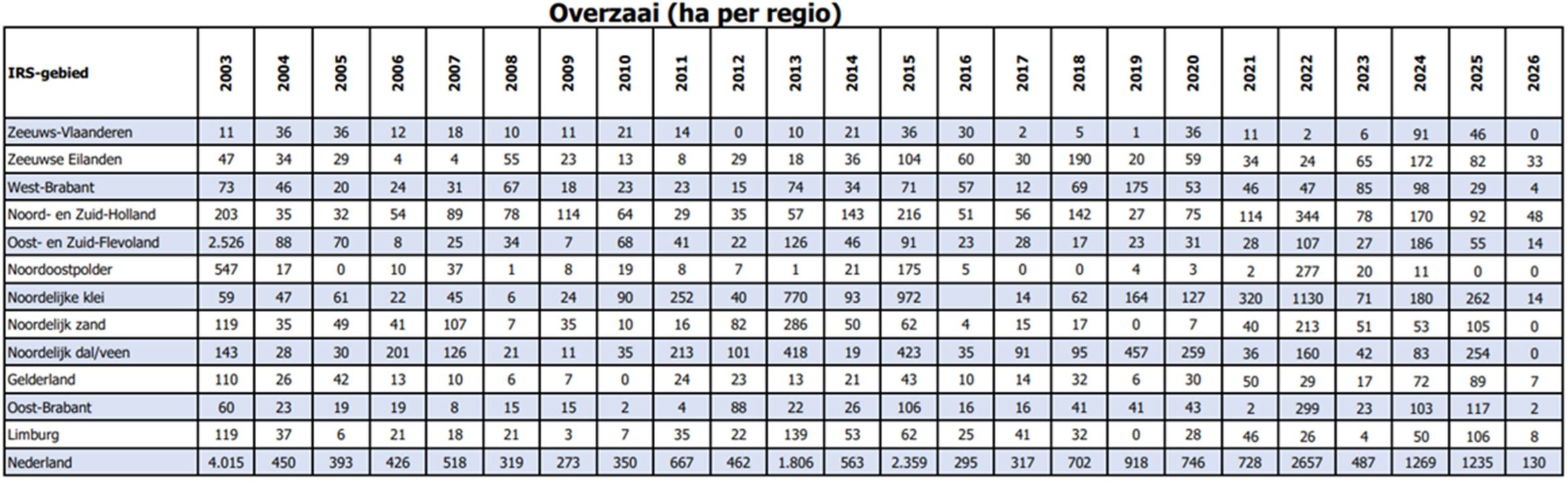 Het aantal overgezaaide hectares staat nu op 130 hectare. In Noord- en Zuid-Holland zijn tot nu toe de meeste hectares overgezaaid: 48 hectare. Daarna volgen de Zeeuwse Eilanden met 33 hectare. In Zeeuws-Vlaanderen, de Noordoostpolder en op het Noordelijke zand en Noordelijke dal/veen staat de teller (nog) op 0. Reden van overzaai is voornamelijk korst (78 procent). Vraatschade door insecten staat op plek twee (11 procent). Schade door muizen (7 procent) wordt ook als reden genoemd. Daarna volgt redenen ‘overig’ (5 procent).
